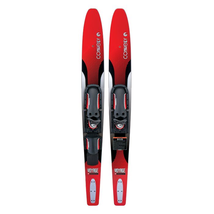 The Voyage combo pair uses a traditional shape with a slightly wider frame, specifically under the bindings and going back to the tail end. The extra surface area makes getting up and out of the water easier while providing you with stability to perfect your balance and stance. Step base technology through the bottom tunnels reduces drag and gives the skis that free maneuvering feeling.