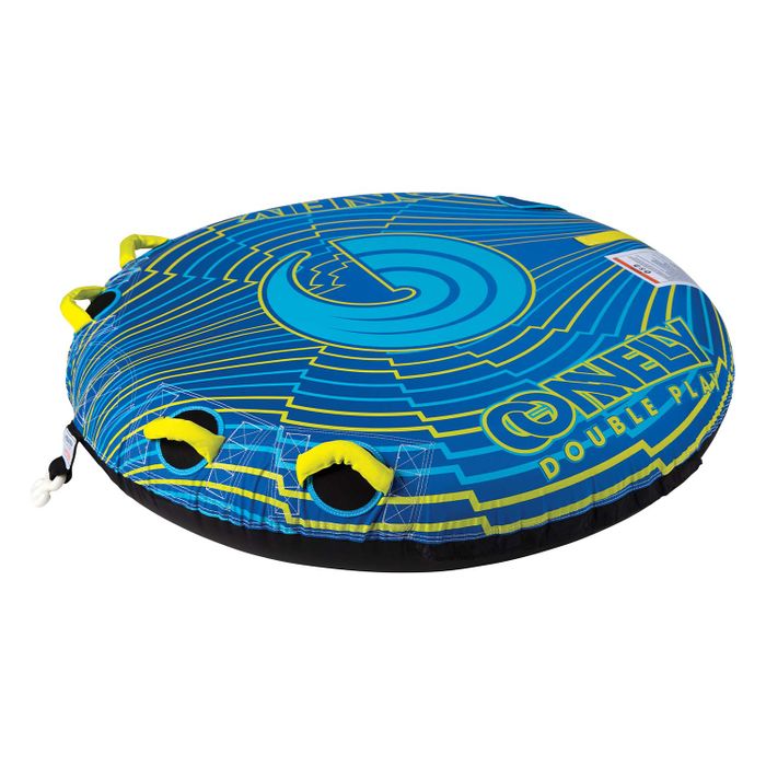 Have some daring fun this summer. Hook up the Connelly Double Play 2-Person Towable Tube to your boat, hop in with a buddy, and ride the wake. The Double Play is a flat, double-rider platform-style tube with a rounded bow for effortless starts, large side gussets for extra stability, and a low center of gravity for safe riding. The large squared-off stern keeps the inner tube stable on turns and in rough conditions. Get on the water quickly. This large, 60-inch inner tube comes with Boston valves for easy inflation. The quick-connect tube ROPES & HANDLES attaches to your boat's tow ROPES & HANDLES in seconds. This inflatable water tube keeps you comfortable as you ride with 4 padded handles with knuckle guards, 1 boarding strap, and a mesh bottom that drains excess water. Made to last summer-after-summer, this boat towable tube sports a 420D nylon cover and heavy duty air bladder.