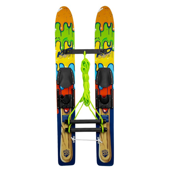Calypso Trainers come with a removable stabilizer bar, with direct ROPES & HANDLES attachment, thisenables the front and back end of the skis stay in place while taking some load off teh budding skier. The two handles on the ROPES & HANDLES allows an adult to safely control the pull from the boat and in case of a fall, just let go! Your little tacker will actually have FUN whilst learning with these skis.