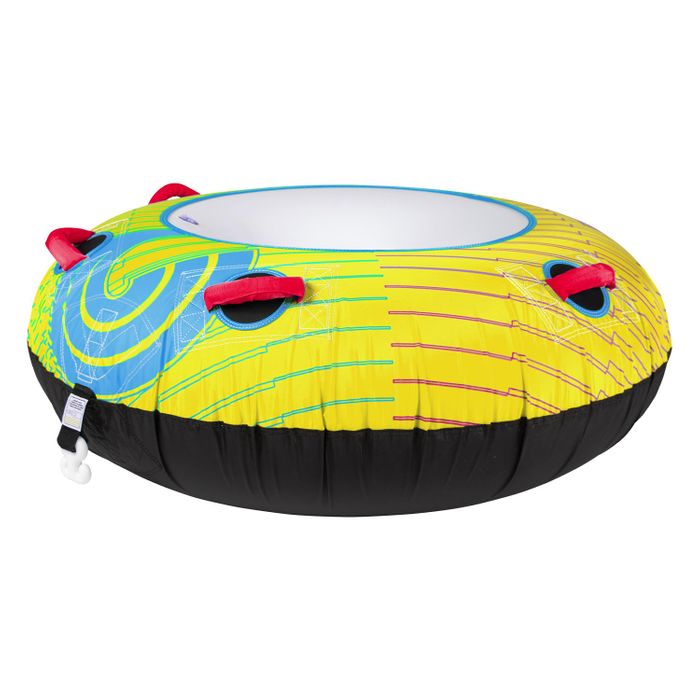 The Spin Cycle has been designed specifically for the smaller rider looking for extreme fun out on the water. Laying prone or sitting in the center location, the rider can choose which position they favor best. This proven design has endured the test of time and will keep you in the middle of the action behind the boat. The mantra "if it's not broken, why fix it?" apply's to the Spin Cycles classic inflatable donut design allows for a variety of riding positions, and the four padded handles feature knuckle guards built into the nylon cover for improved comfort. A mesh bottom lets water drain out for added convenience and faster speeds, and the heavy-duty rubber bladder offers strong performance for many days behind the boat.